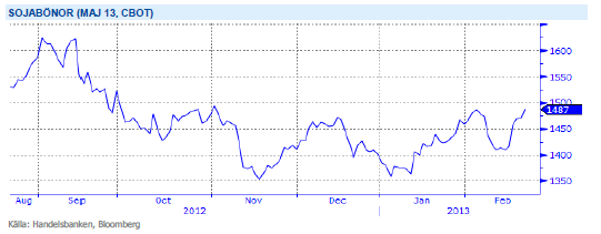 Sojabönor har stigit kraftigt under veckan med fortsatt stark amerikansk export (som vanligt med Kina som största köpare). I Brasilien fortsätter skörden utan större problem, drygt 20 procent av skörden bedöms vara avklarad. USDA beräknar årets kommande amerikanska sojaskörd till rekordhöga 93 miljoner ton, upp 12,9 procent jämfört med förra året. Stark efterfrågan och låga lagernivåer driver upp priserna och på kort sikt är det svårt att se en nedsida för sojan. Faller USDA:s prognos väl in för årets skörd lär vi dock få se klart lägre priser längre fram på året, grödan ska dock först sås och mycket kan hända innan skörd. Priset på majs har fallit under veckan efter nederbörd fallit över de amerikanska majsregionerna – mer önskas men oron har lindrats. Längst ned i de södra delarna av USA har sådden redan startat, i de mer viktiga majsregionerna längre norrut är det dock ännu för kallt och torrt. I Argentina har det fallit lite mer regn, vilket helt klart gynnar den relativt nysådda majsen, nästa vecka ser dock ut att bli lite torrare. Med förbättrad väderlek i både USA och Sydamerika finns all möjlighet för priserna att falla ytterligare. USDA uppskattar nu kommande amerikanska majsskörd till 35 procent över förra året med rekordhöga 369 miljoner ton.