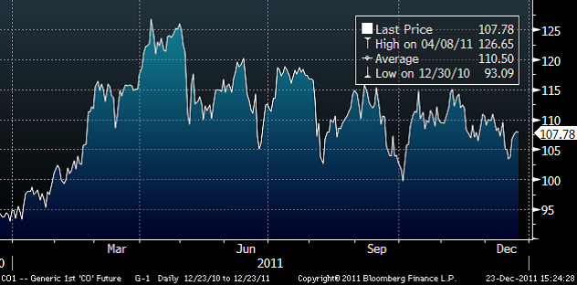 Lagernivåerna i USA sjönk med 10.6 miljoner fat under veckan vilket är den största fallet på tio år och lagren ligger nu på tre års lägsta. Spreaden mellan WTI och Brent har som ett resultat av detta krupit ihop till 9 dollar. Det spekuleras i om de låga siffrorna är ett resultat av ett något större skatteupplägg än tidigare år, dvs raffinaderiers ”gömda” lager inför årsskifte för att undgå skatt. Detta är tydligt eftersom hela 70 procent av lagerfallet är vid mexikanska golfen där råoljan enkelt kan föras tillbaka till oljetankar. Vi kan mao räkna med att dessa siffror som nu ser bullish ut stiger till något mer neutrala efter årsskiftet. I övrigt noteras även i Nordöstra i USA milda temperaturer och en något lägre efterfrågan på heating oil. Vi trodde att Brent oljan successivt skulle tappa mot slutet av året men nere på 103 dollar (se bilden nedan) fanns det tillräckligt med stöd och intressen vilket innebär att vi nu räknar med neutral till positiv utveckling på kort sikt.