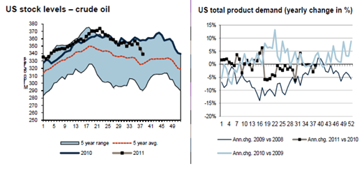 Brentoljan har fallit med närmare 7 procent under veckan till lite drygt 105 dollar per fat. Det är den lägsta nivån sedan början av augusti. Lagernivåerna kom in långt under förväntan, råoljelagren föll hela 7.3 miljoner fat mot 0.3 miljoner fat väntat, och har därmed fallit 18 miljoner fat de senaste tre veckorna, se nedan. Denna veckans siffra kan delvis förklaras av ett högre kapacitetsutnyttjande, 86.3procent mot 84.7 procent förra veckan. Samtidigt var importen något lägre, 8.35 miljoner fat/dag mot tidigare 8.54 miljoner fat/dag.