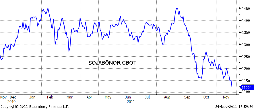 Det är med rådande problem i världsekonomin svårt att se någon större uppsida för sojabönorna, samtidigt väntas Kina fortsätta att vara en aktiv importör av amerikansk soja – vilket bör begränsa en eventuell nedgång. Om faran om försämrat väder i Sydamerika besannas bör dock sojapriserna, precis som majspriserna, kunna återhämta sig något.