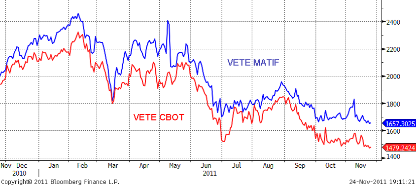 Vetepriset på Matif har gått ned sedan förra torsdagens stängningskurs, likaså vetet i Chicago. Orsaken till nedgången är främst en ökad oro för den globala ekonomin, dels EU:s skuldkris men under veckan har oron ökat även för utvecklingen i USA och Kina.