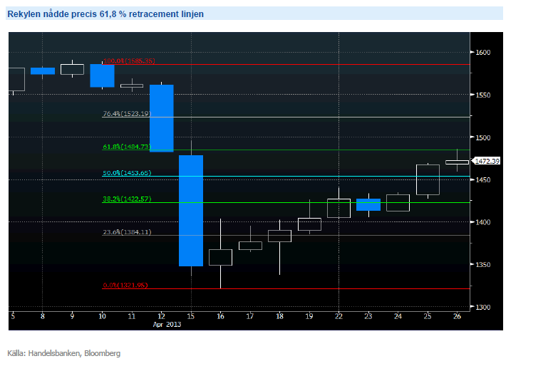 Köp inte guld. För den som är tekniskt intresserad kan nämnas att rekylen nu vände på exakt 61,8 % retracement, en viktig s.k. Fibonacci-nivå.