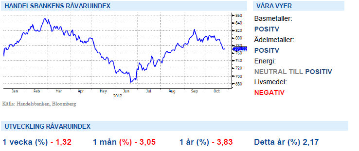 Det senaste rallyt i råvaror har främst skett i bas- och ädelmetaller. Den sista raketen var Kinas infrastrukturpaket den 7e september och QE3 i USA den 14e september. Därefter har åter oro för Europas skuldkris och sämre än väntat bolagsrapporter för Q3 tyngt marknaden. Dåliga nyheter har fört tillbaka metallerna till samma nivåer som före Kinas infrastrukturprogram. Så i princip hela QE3 effekten är nu utraderad.