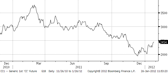 Kakaopriset har stigit 15 procent under januari som en följd av spekulationer att den globala kakaoproduktionen kan komma att falla 10 procent för säsongen som startade i oktober, jämfört med året innan. Vädret kring Elfenbenskusten fortsätter att vara varmt och torrt och skörden för säsongen ser ut att lida mot sitt slut redan, normalt brukar skördeperioden sträcka sig ända in på slutet av mars. Vi har även kunnat läsa om högre skatter från exportörerna i Västafrika. Skulle detta bli verklighet så skulle dyrare priser komma att bli ett faktum och just nu pågår diskussioner kring subventioner och andra lösningar för att hjälpa berörda i området. Vi kan mycket väl ha sett bottenpriser på kakao men det återstår att se om den ökade efterfrågan från Europa håller i sig samt hur det globala överskottet och lägre konsumtion av kakao utvecklar sig.
