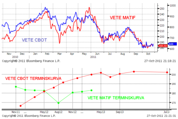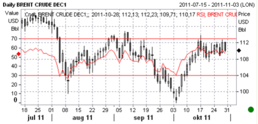 Oljepriset (Brent) handlades oförändrat över veckan och på 109.9 dollar per fat i skrivandets stund. Den amerikanska WTI olja steg tidigare i veckan till den högsta nivån på 12 veckor till följd av spekulationer om förbättrad amerikanska efterfrågan på olja och att europeiska ledare kommer att nå en godtagbar lösning i förhållande till skuldkrisen. Prisskillnaden mellan WTI och Brent är nu endast 17.16 dollar, vilket är den lägsta spreaden sedan 6 juli. Amerikanska råoljelager ökade med 4,7 miljoner fat (väntat 1,3 m fat) efter att importen ökat från förra veckans låga nivå. Bensin lagren sjönk med 1,4 miljoner fat (väntat-1.6m fat) och destillat 4,3 fat (förväntat -1,9 m fat).