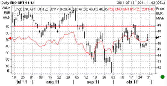 Elmarknaden handlas oförändrat mot slutet av veckan där inledningsvis blöta prognoser och fallande kurser förbyttes mot ett torrare scenario och stigande kurser på såväl el som bränslen. Den svenska kärnkraften går nu på 64 procent och med gällande väderprognoser förväntas energibalansen hamna på +4.6 TWh mot slutet av vecka 44.