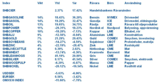 Handelsbankens råvaruindex består av de underliggande indexen för respektive råvara. Vikterna är bestämda till hälften från värdet av global produktion och till hälften från likviditeten i terminskontrakten.