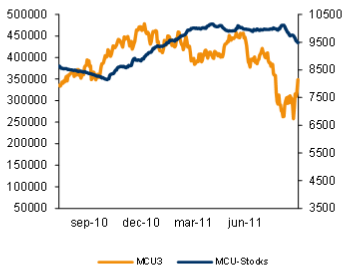 På metallerna har priserna ökat kraftigt den senaste veckan efter att EU-toppmötet stärkt marknadens förtroende för en lösning av Europas skuldkris. Störst uppgång på koppar som stigit med 13 procent, den största veckouppgången sedan 1986. LME lagernivåer på koppar har minskat sedan förra fredagen med 15 425 ton till 432 375 ton, vilket hjälper till att stärka priset. Sedan mitten av september pågår även en strejk vid världens näst största koppargruva Grasberg i Indonesien, där arbetarna kräver bättre löner och villkor. Strejken väntas pågå en månad där varje dag av stoppad produktion innebär ett bortfall på 1 500 ton koppar och 140 kilo guld. Då kopparpriset är konjunkturkänsligt ser vi ett fortsatt volatilt pris så länge situationen i Europa inte stabiliseras. På lite längre sikt tror vi på en uppgång. Bilden nedan visar lagernivåer och priset på koppar ett år tillbaka.