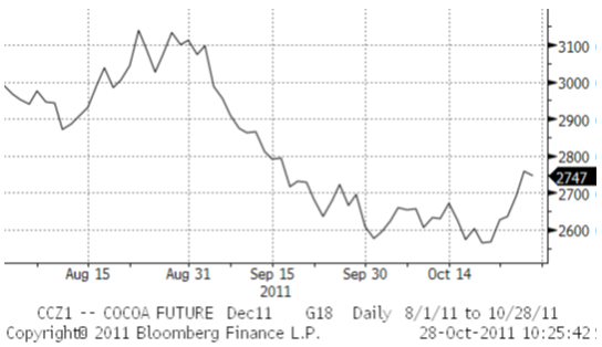 Priserna har fallit 30 procent i år, från rekordhöga nivåer sedan 30 år tillbaka, som följd av en ökning av produktionen i Elfenbenskusten och Ghana. Spekulationer kring överskott av kakao på marknaden fortsätter att hålla priserna nere. Europeiska konsumtionen steg 14 procent under det tredje kvartalet till den högsta nivån sen 1999, enligt European Cocoa Association. Det kommer rapporter om att vädret har stabiliserats i västra Afrika. Försenade leveranser av kakaobönor till Elfenbenskustens hamnar har fått priset att stiga under senaste veckan.