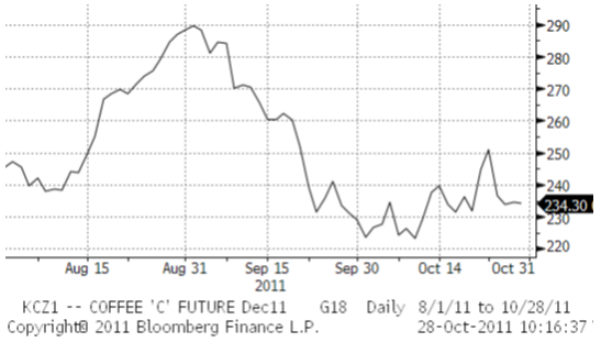 Förra veckan kunde vi se kaffepriset stiga 8 procent bla till följd av all den nederbörd i Centralamerika och Colombia som kan komma att ge sämre kvantitet och kvalitet av utblomningen. I början av veckan föll priset tillbaka i takt med övriga något när den Europeiska skuldkrisen eskalerade men det spekuleras också om hur kraftig storm orkanen Rina kan komma att orsaka om den passerar Centralamerikas kust.