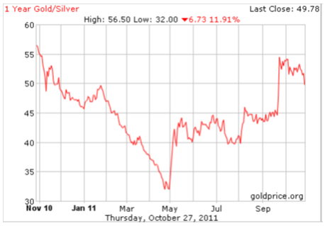 Guld har haft en strålande vecka med sin största veckouppgång sedan augusti. Guldet handlas i skrivande stund runt $1740/ounce. Efter de senaste dagarnas lyckade förhandlingar inom EU/EMU, så tror vi inte guldet kommer fortsätta uppåt på kort sikt. Om vi ser på längre sikt, så finns det en god underliggande efterfrågan på guld. Enligt World Gold Council så kommer centralbankerna vara nettoköpare av guld de kommande åren. Samtidigt verkar inte Indiens och Kinas guldhunger dämpas. Silver har haft sin största veckouppgång sedan september 2008 (upp 13% på en vecka) och handlas just nu på $ 35.25 /ounce. Silvret summerar en uppgång på 12.7% sedan årets början. Bifogat nedan är en graf som visar skillnaden mellan guld och silver vilken om man ser till det senaste året också kan tyda på ett något högt guldpris.