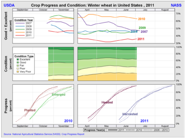 Andelen av grödan som uppgavs vara i skicket ”good/excellent” var 54 procent, upp en procentenhet från föregående vecka. Andelen av grödan som bedöms vara i skicket ”poor/very poor” var 19 procent, oförändrat från föregående vecka.