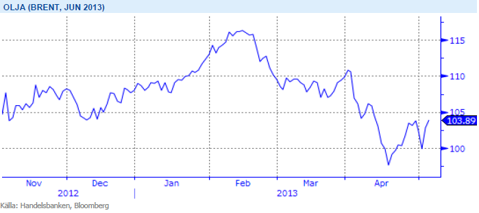 Oljan (brent) har följt med makrodata under veckan, ner under 100 efter PMI siffror för att senare stärkas efter positiv jobbdata och handlas nu över 104 USD/fat. Ryssland ökar sin produktion under april med 1,5 % y-o-y till 10,47 miljoner fat per dag och president Putin kräver att produktionen ska upprätthållas över 10 miljoner fat per dag. Vi behåller vår positiva vy för denna sektor.