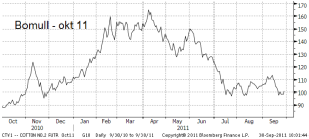 Det som talar för en stabilisering av bomullspriset är att prognoserna av den totala lagernivån vid årets slut är relativt låga och trots prognoser på rekordhög skörd i år samt att förhållandet mellan utgående lager och årlig konsumtion är 45 % (mot förra årets 38 %) så är fortfarande siffran den lägsta sedan 1995. Dessutom har Pakistan som är fjärde rankade land av bomullsproduktion förlorat en stor del av sina plantor den senaste månaden i översvämningar, samt att orkanen Irene orsakade mer förstörelser än man trott på bomullsplantagerna i USA.