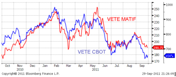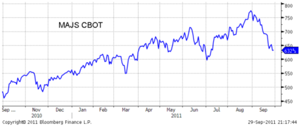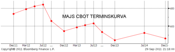 Terminspriserna på majs i Chicago har fortsatt nedåt, som för övriga råvaror påverkat av en ökad oro för den globala ekonomin och brist på viktiga fundamentala nyheter. Majsen har backat omkring 18 procent i pris sedan slutet av augusti månad, vilket i samband med gällande lagernivåer kan tyckas vara något överdrivet. Skörderapporter pekar dessutom på något lägre avkastningsnivå än väntat.