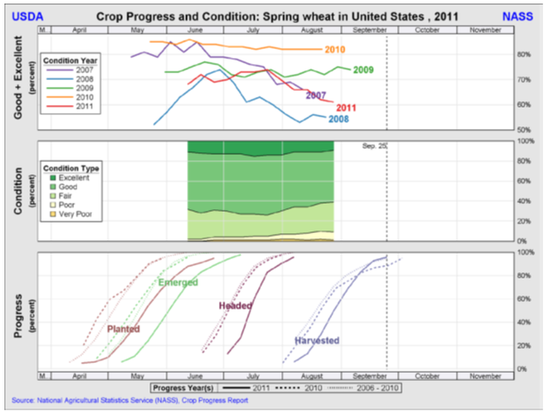 Den amerikanska skörden av vårvete uppgavs vara till 96 procent avklarad, upp från förra veckans 93 procent. Vid samma tid förra året var 89 procent av skörden klar och genomsnittet för de senaste fem åren är 95 procent.