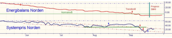 Spotpriset i Sverige har hittills i år varit ca 47 öre per kWh (52 öre per kWh för samma period förra året). Spotpriset har kommit in extremt lågtt och legat under 30 euro / MWh de senaste 2 veckorna. Spotpriset för imorgon lördag är så lågt som 6.27 euro för systempris (snitt i Norden) och 9.14 euro för Sverige då vattenproducenter tvingats köra väldigt mycket vatten. Så länge vi får mycket vatten och spotpriserna är låga finns det ingen anledning till att köpa el just nu utan vi förväntar oss att marknaden fortsätter ned.