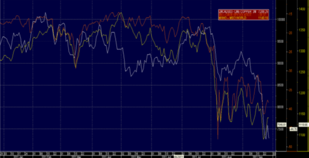 Råvarorna har stabiliserats något under veckan men sentimentet har försvagats och de kraftiga rörelserna på världens börser skapar oro. Det är tydligt att investerarkollektivet skruvat ned förväntningarna, korta positioner bland icke-kommersiella aktörer har ökat samtidigt som både hedgefonder och index investerare minskat sina långa positioner. Uttalande från Fed har betonat myndighetens oförmåga att göra mycket för att stimulera den amerikanska ekonomi, man verkar lämna sitt öde till politiker. Det är inte särskilt förtroendeingivande i sig utan bidrar till den stora utförsäljningen av riskrelaterade tillgångar, såsom aktier och råvaror. Koppar är ju den typiska barometerråvaran och nedan ser ni VIX index (volatilitetsindex för S&P 500 optioner), även kallat fear index i rött, mot LME Koppar (vitt) och MSCI (gult) som ger en intressant bild över situationen.