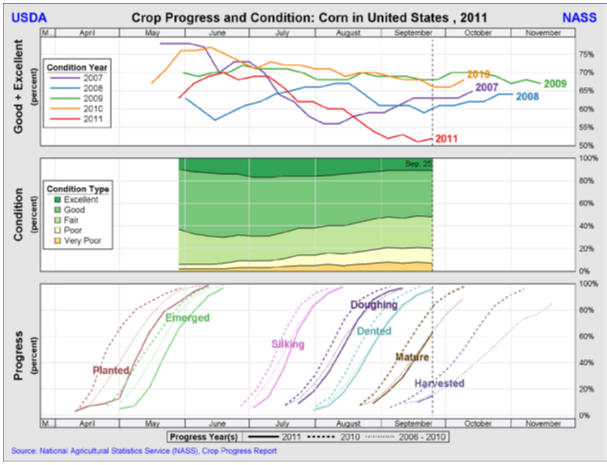 63 procent av grödan uppgavs vara mogen för skörd, jämfört med 46 procent förra veckan. Klart efter förra årets 83 procent vid samma tidpunkt och även efter genomsnittet för de senaste fem åren om 64 procent.