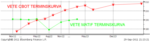 Blickarna har de senaste dagarna även riktats mot dagens rapport från USDA, i vilken uppskattning om lagernivåer den 1 september presenteras. Viss oro finns att USDA uppskattar majslagret till något högre nivå än väntat, vilket skulle vara en följd av den ökade användningen av fodervete som följd av höga majspriser. Samtidigt borde det vara svårt att överraska marknaden tillräckligt för att kunna pressa ned priserna i högre grad utifrån den senaste tidens kraftiga nedgång.