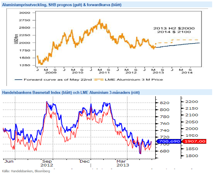 Bland metallerna håller vi Aluminium som en liten favorit inte minst om man tittar på den tekniska bilden. Nedan ser ni prisutvecklingen samt marknadens forwardpris i blått och vår egen prognos i gult.