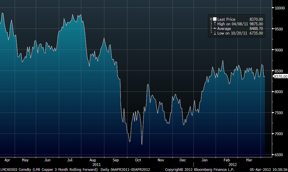 Koppar har haft en volatil vecka. Metallen var upp som mest 2.3% för att sluta veckan på en total nedgång på 1 %. Uppgången sedan årets början är 7.3 %. Den dåliga spanska obligationsmissionen låg bakom den kraftiga nedgången i mitten av veckan. Priset återhämtade sig dock under torsdagen på rykten om en mindre stram kinesisk penningpolitik. Premiärminister Wen Jiabao sade i en intervju att Kina planerar justeringar av penningpolitiken ”inom en snar framtid”. Marknaden verkar vara i balans på utbuds- och efterfrågesida. Lagernivåerna hos LME är fortfarande låga men det motsvaras av ökade lager i Shanghai. Lagernivåerna i Kina har alltid varit problematiska att uppskatta, men vi anser att de senaste estimaten är någorlunda korrekta och därför är vi neutrala till kopparpriset.