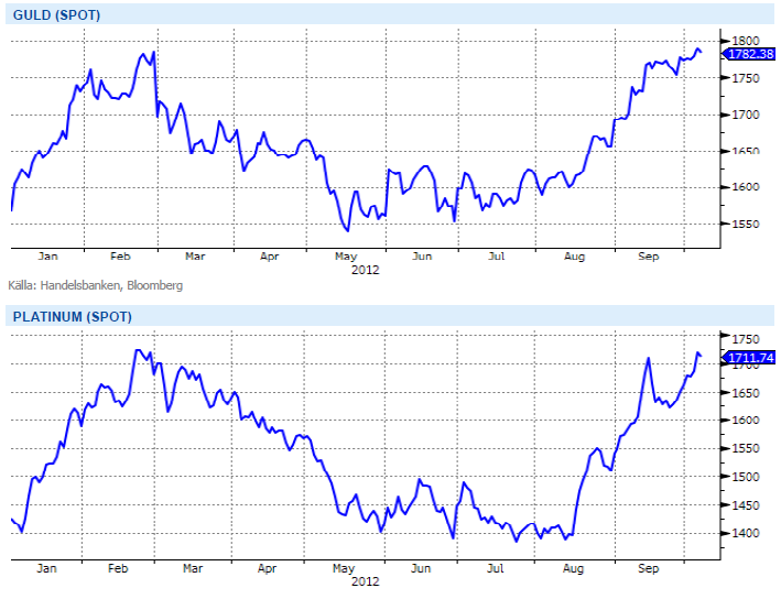 Vi fortsätter att se centralbankernas nytryckta pengar och framförallt feds QE3-operation som starka skäl att vara investerad i ädelmetallerna. Konflikterna i Sydafrika fortsätter och ger stöd åt Platina- och guldpriset. Vi tror på: ADELMET H