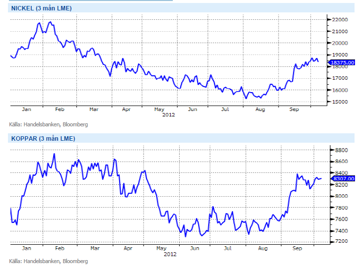 Basmetallerna fortsätter att glida uppåt, drivet av stimulanser från centralbankerna. Mest har kopparn gått upp; drygt 1.5 %. Aluminium har haft det lite tuffare med en smärre uppgång på 0.2 %. Nickel är upp 0.8 % medan zink var veckans förlorare med en nedgång på 1.2 %.