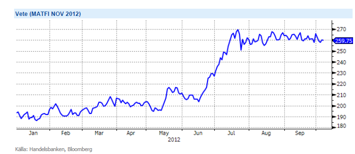 Skörden av majs i USA fortgår i väldigt rask takt, faktiskt rekordsnabbt inte minst på grund av det torra vädret. För tillfället är omkring 60 procent av skörden klar – ungefär dubbelt så mycket som normalt vid denna tid på året. Liknande situation ser vi även för sojabönorna med omkring 50 procent skördat mot normalt omkring 30 procent. Den snabba skörden sätter lite extra säsongsmässig skördepress på priserna på både majs och soja – vilket även drar ned vetepriserna lite. Mest har sojapriserna fallit vilket påverkats även av något högre avkastning än väntat så här långt.