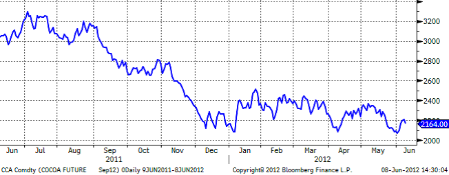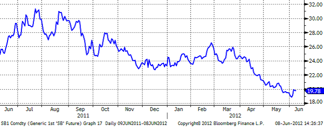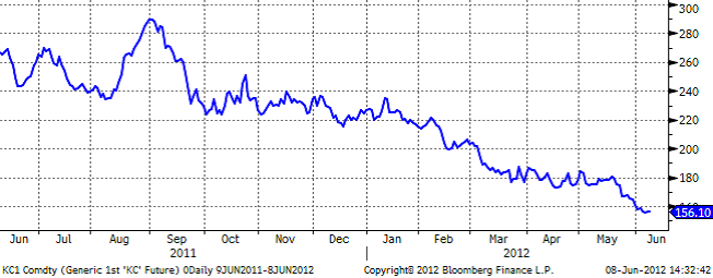 Världens största kaffeproducent Brasiliens valuta Real fortsätter att vara svag gentemot dollarn vilket har genererat en högre exportvolym och större utbud på den internationella marknaden. Priset på kaffe fortsätter på låga nivåer och Arabica terminerna har fallit tillbaka med över 30 % i år. Globala kaffeproduktionen har reviderats upp för säsongen som påbörjats i oktober. Globala kaffekonsumtionen steg 1,7 % under 2011 vilket är något under snittet för de senaste 12 åren, enligt International Coffee Organization. All Japan Coffee Association rapporterar något lägre lagersiffror, april ner 2,4 % jämfört med mars och med andra ord andra månaden i följd som japanska kaffelagren minskar.