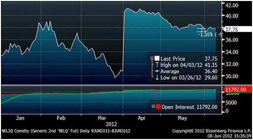 Kvartalet Q4 2012 som från och med denna vecka är underliggande för SHB Power Index handlas på 37.65 euro mot slutet av veckan vilket får ses som förhållandevis lågt om man tänker på att kontraktet omfattar ett antal vinterdagar där det alltid finns risk för kyla och bortfall av kärnkraftskapacitet som kan dra upp spotnivåerna. Vi har dock svårt att se hur kontraktet skall stiga på kort sikt när de flesta faktorer pekar fortsatt ned och marknaden fastnat i en range. Med andra ord kan det vara klart intressant för den som kanske vill prissäkra de lite längre kontrakt men mindre intressant för den som vill gå in i ett hävstångscertifikat just nu eftersom man sannolikt behöver sitta på det en längre tid innan vi lyckas bryta ur dessa nivåer.
