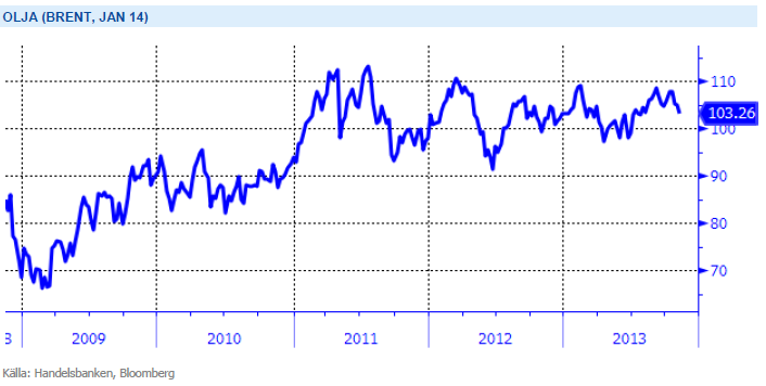 Under veckan har oljepriset handlats ner med drygt 2 procent. Sentimentet tyngs av produktion över förväntan (främst USA) samt signaler på att Libyen återupptar takten snabbare än väntat. Lagersiffrorna visar på fortsatt ökning även denna vecka varför vi finner dagens nivå köpvärd och ser risken på nedsidan begränsad.
