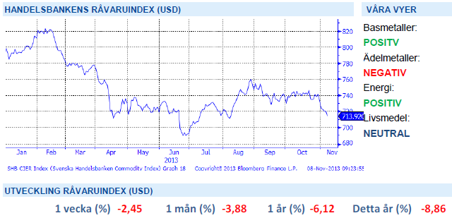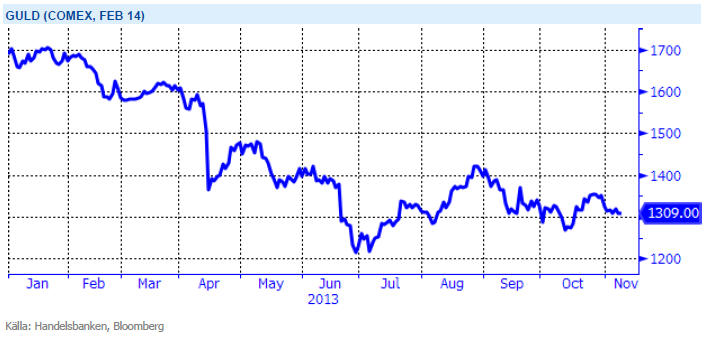 Vårt basresonemang runt den negativa synen på guldet är ju att det drivs primärt av aktörers vilja att tjäna pengar – inte av reala fysiska behov som övriga råvaror – vilket i en nedåttrend som nu gör utvecklingen svår att vända. Data från USA fortsätter att peka mot att Federal Reserve kommer att minska sina stimulanser (tapering) i början av nästa år, vilket sannolikt kommer att sätta ytterligare press neråt på guldet. 1000 dollar per uns ligger tillräckligt nära för att ses som en risknivå om priset nu börjar glida neråt igen.