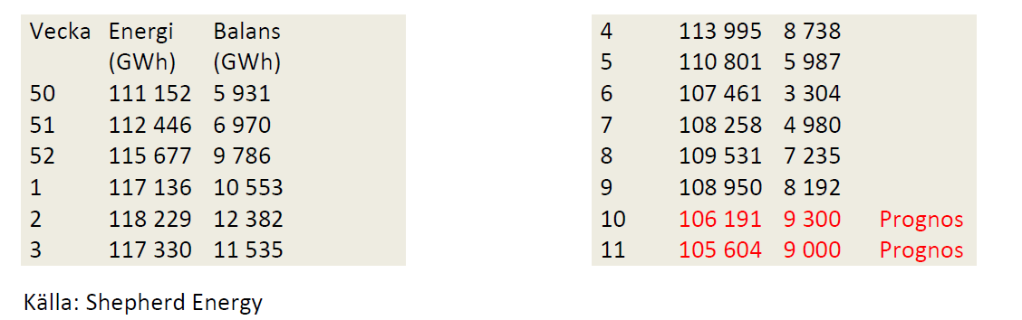 Vi har under veckan rullat det underliggande elkontraktet i SHB Power Index till tredje kvartalet Q3 2012 på elbörsen som i skrivande stund handlas kring 34 euro, lite drygt 2 procent ned över veckan. Ett stigande bränslekomplex där bl.a. energikolet fann stöd och steg med 2.25 procent (närmaste kvartalet) och stark utveckling på den Tyska marknaden balanseras av vikande utsläppskostnader och fortsatt milt och vått väder här i Norden. Energikolet har de senaste veckorna sett ut att vara i god balans med ett överskott men det verkar nu som marknadsoron tilltagit något. Inget nämnvärt att rapportera kring den Svenska kärnkraften som går på strax över 80 procent av installerad effekt. En stor del av den nederbörd som prognostiserats för denna vecka föll bort vilket innebär att vi ligger kvar på en i stort sett oförändrad energibalans om ca 8 TWh över normalen.