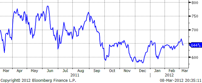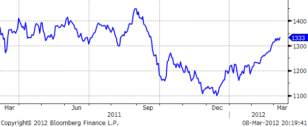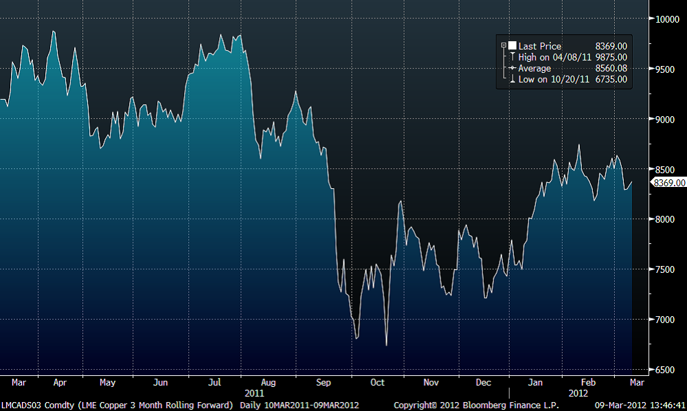Koppar har i likhet med de andra basmetallerna tagit stryk denna vecka. Nedgången ligger i skrivande stund på 2.25%, trots en uppgång de tre senaste dagarna. Detta är den första nedgången på veckobasis på tre veckor. De två första handelsdagarna i veckan präglades av en allmän oro kring risktillgångar och kring Grekland i synnerhet. Risksentimentet har som sagt förbättrats de senaste dagarna, efter att Greklands skuldnedskrivning har genomförts. Vi är grundpositiva till koppar, trots rapporter om kraftiga produktionsökningar i Kina (upp 9.5% från året innan). Vi tror fortsatt att ECB:s långa lån till bankerna kommer sippra ut i den reala ekonomin och på så sätt skapa press uppåt på basmetallpriserna. Ett exempel på att så redan kan vara fallet kan vi hitta i den fysiska marknaden för koppar. När koppar levereras till olika platser i världen får leverantören lägga till en premie för leveransort och försäkring. Priset för leverans till Rotterdam har gått upp från 30 USD/ton för tre månader sedan 100 USD/ton idag.