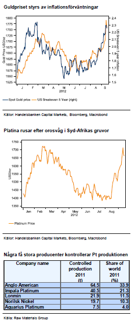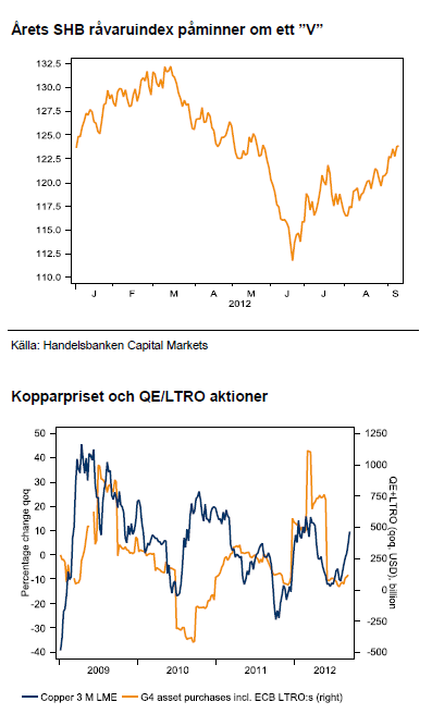 Högre priser på råvaror och nedreviderade utsikter för de stora ekonomierna skapar förnimmelser av en marknad likt ett korthus. Vi lutar oss dock mot att Kina intensifierat stimulansvågen och att centralbankerna åter satt ner foten både genom mycket prat men till slut även handling, viktigast genom QE3. Perioder med lättare penningpolitik har under de senaste åren gett en råvarumarknad som ”glider uppåt”. Med stimulanser i luften tror vi att breda råvaruindex kommer stiga under resten av året. I en sådan miljö, med ett starkare Kina och stimulanspengar i systemet, förväntar vi oss att bas- och ädelmetaller kommer stiga mer än olja och spannmål. Guld har fått styrfart uppåt på utsikterna om frikostig penningpolitik i USA och Europa och vi intensifierar vår tro på ett stigande guldpris.