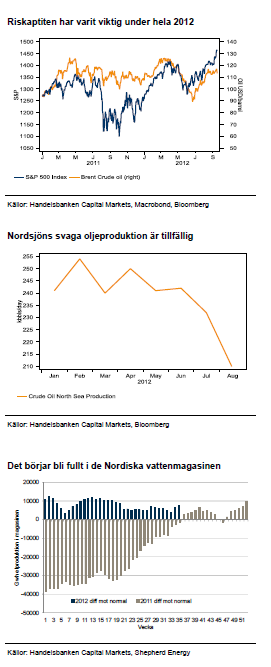 Brent handlas FOB Shetlandsöarna. Utbudsstörningar i Nordsjön har haft en kraftig inverkan på priset under september. Dessa är av tillfällig art, Nordsjön kommer öka med 25 % i oktober och vi ser mer nedsida än uppsida i Brentpriset rent fundamentalt. Att centralbankerna står på gasen väger dock på uppsidan. Vi upprepar vår prognos för H2 på 110 USD.
