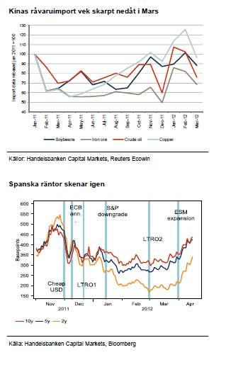 Wen Jiabao sköt av startskottet för oron kring Kina när han sänkte det officiella tillväxtmålet för Kina från 8 till 7,5 % för 2012. Ett litet steg för Kina, men med ett stort symbolvärde för omvärlden. Därefter har Wen också sagt att han vill se lägre fastighetspriser. Sedan har vi inte hört mer utan fått förlita oss till data som kommit från Kina under mars månad. Efter januari och februari som är statistiskt svårtolkade månader på grund av nyårsfirandet har marsdata inte visat på den styrka man hade hoppats på.