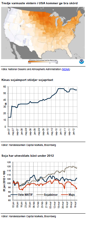 Även sådden av majs i USA fortgår i rask takt. Rekordhöga 25 procent av sådden uppges vara avklarad mot normalt 13 procent vid denna tid. Det i kombination med goda väderutsikter borgar precis som för vetet för en kommande hög produktion. Majspriset hålls idag uppe delvis som följd av hård konkurrens med sojabönorna om areal. När den kampen är klar bör majspriserna kunna backa tillbaka något ytterligare, förutsatt att de goda väderutsikterna håller. Stram marknadsbalans och starkt köpintresse från Kina, förmodligen ökande, bör dock begränsa nedgången. Majs och vete är i hög grad substitut till djurfoder och lägre priser på majs leder oftast till lägre priser på vete – som i sig själv har svårt att finna egen styrka till uppgång i dagsläget.
