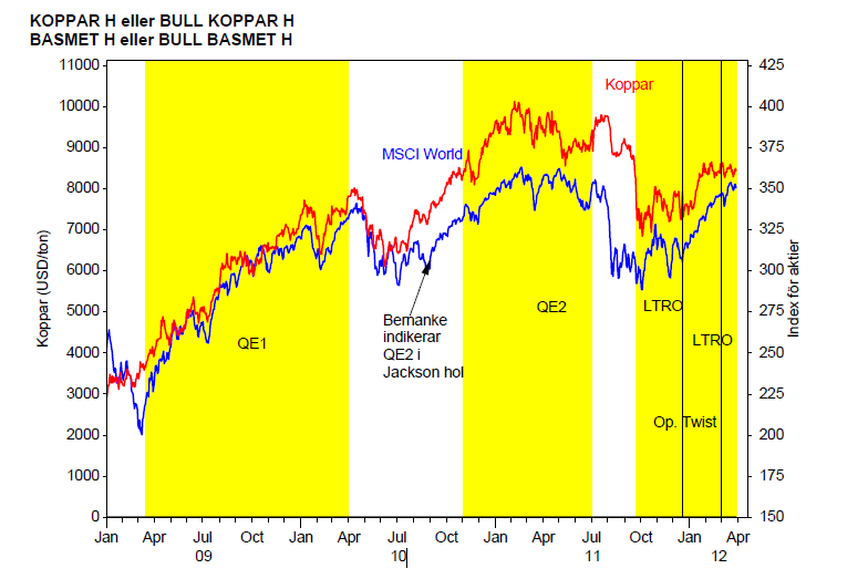 På räntemarknaden har vi sett samma rörelser av LTRO2 som av LTRO1 men med klart mindre kraft. De nya pengarna har inte räckt för att driva upp koppar och basmetaller i en miljö med sämre kinesisk makrodata och vi väljer därför att gå ur positionen och avvakta utvecklingen i Kina före vi tar ny ställning.
