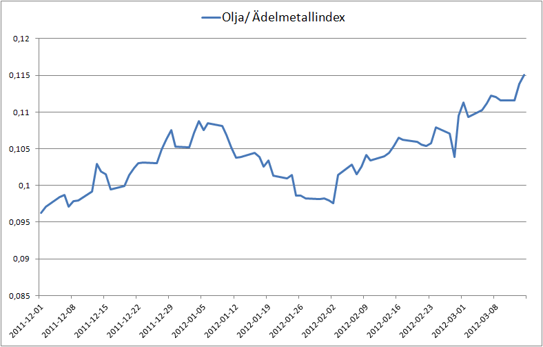Grafen nedan visar hur oljepriset har stärkts mot Ädelmetallindex under de senaste månaderna. Vi tror att denna utveckling kommer att fortsätta.
