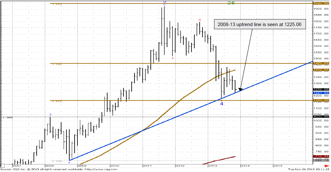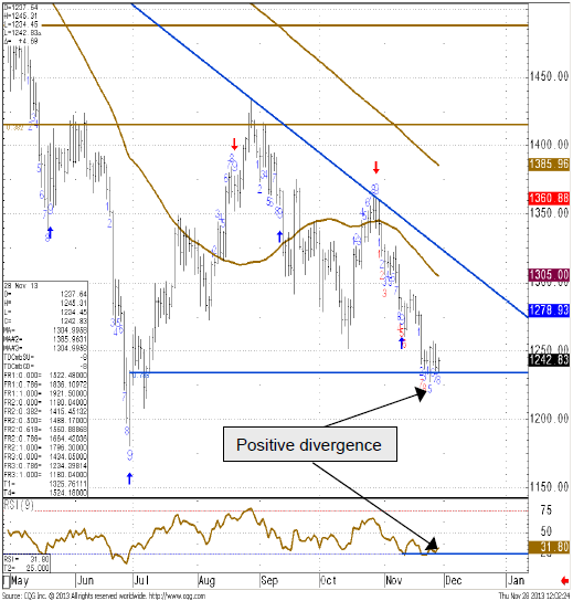 - Our short term gold forecast has been neutralised because of the positive divergence which can be seen on the daily RSI and Monday’s bullish key reversal day as well as the 2008-13 uptrend line at 1225.06 underpinning. Therefore cover at least some of your shorts at current levels.