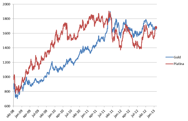 Platina och gulds utveckling sedan 2008. Guld har sedan september 2011 handlats till ett dyrare pris än platina. Något som nu kan ändras.