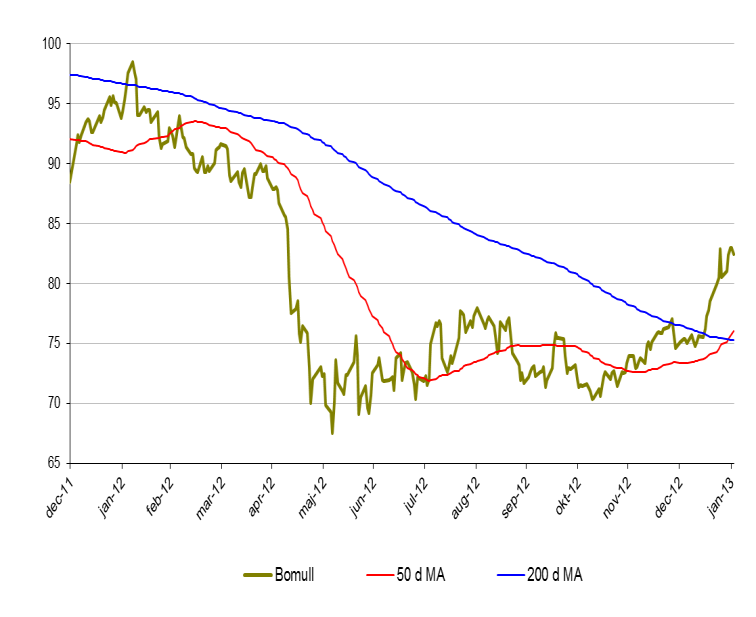 - Bomull befinner sig i en kortsiktigt positiv trend. Sedan oktober förra året är bomull upp dryga 20 %.