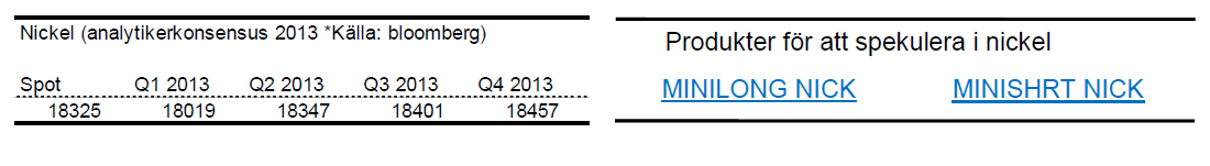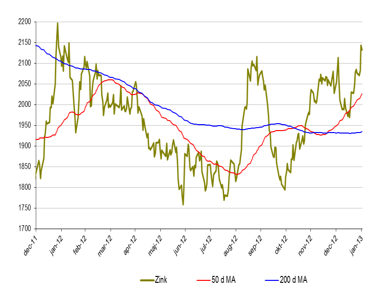 - Zink närmar sig nu viktiga nivåer kring 2150 där vi har en rad motståndsnivåer. Blir intressant att följa under 2013.