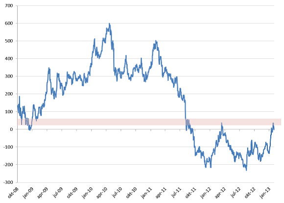Skillnaden i pris mellan guld och platina (spread) är nu åter vid nollinjen (se bild ovan). Om man tror att spreaden nu ska öka, till platinas fördel, kan man använda följande strategi.