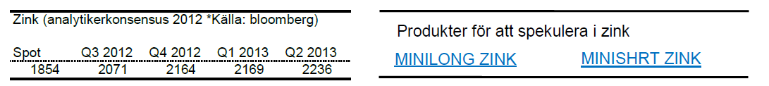 - Tillgången på zink är stort och priset påverkas negativt av rapporter om stigande lager. Detta kan trycka ned priset ytterligare.