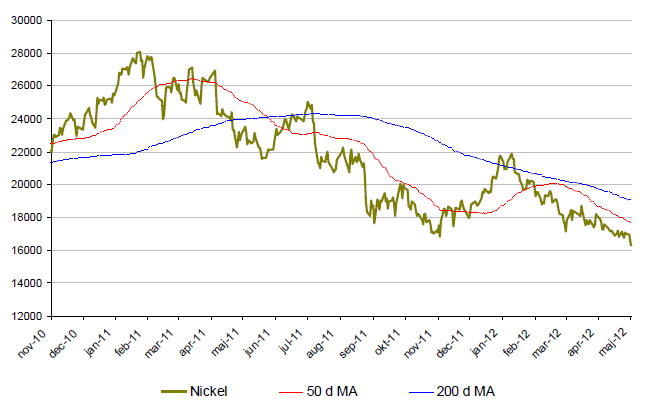 - Nickel fortsätter sin kräftgång under 2012. I maj backade nickel över 8% och är för året ned nästan 9%.