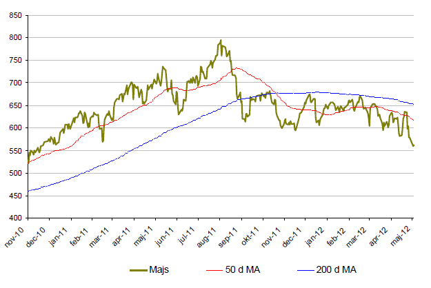 - Majspriset är under maj månad ned över 14% vilket också motsvarar årsnedgpngen i majs.