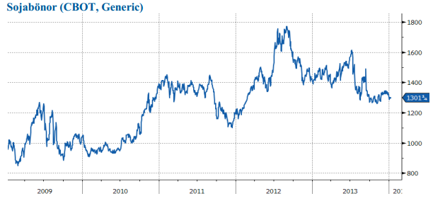 Sojapriset på väg ned? Priset på majs och vete har fallit kraftigt den senaste tiden, under en sexmånadersperiod noteras termin för leverans mars 2014 ned 17 respektive 23 procent. Under samma period noteras motsvarande termin för sojabönor nästintill oförändrad – vilket dock kan tyckas befogat då tillgången på sojabönor varit mer begränsad samtidigt som efterfrågan, inte minst från Kina, varit fortsatt stark.